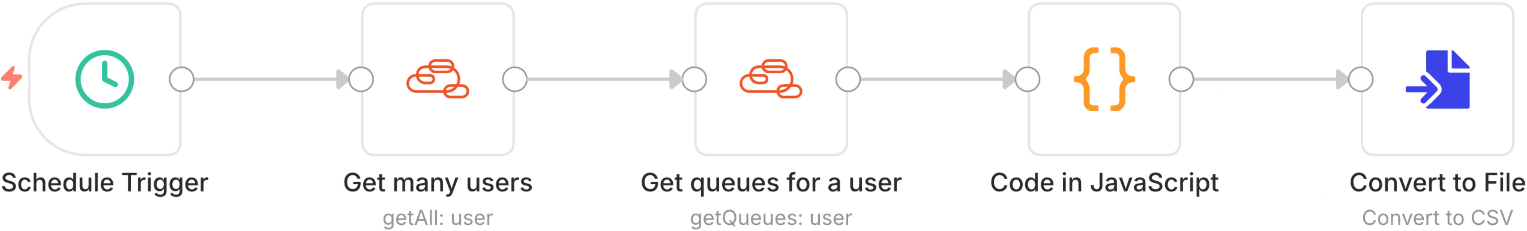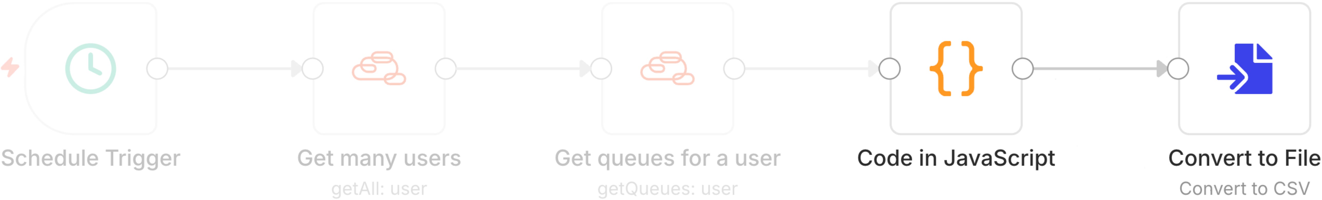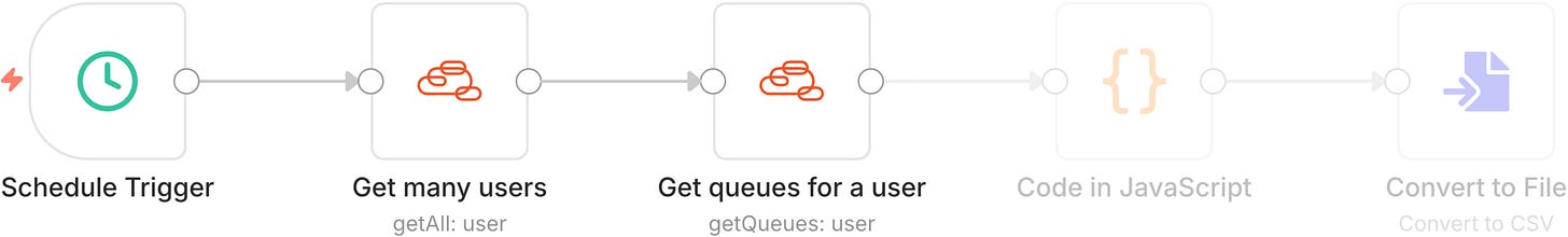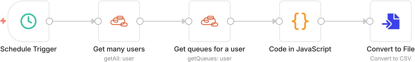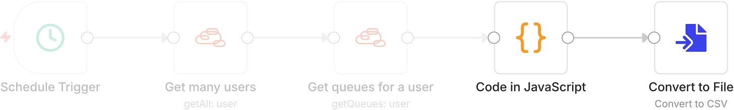 Now we have all the data for our report (users and their assigned queues) I’ll show how, even though n8n allows for code-less automation, you can always add code if you want to.
