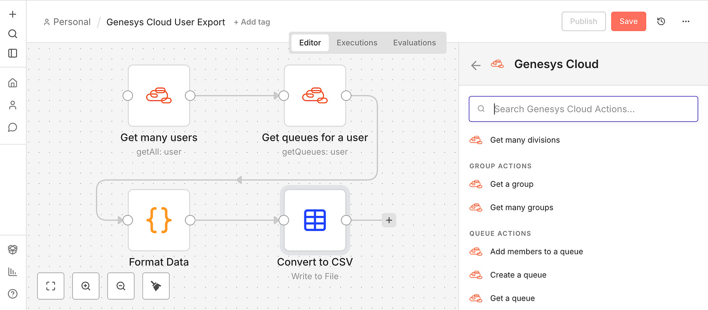 I have created an open-source n8n Genesys Cloud community node. It allows you to leverage n8n, one of the world’s leading workflow automation platforms to easily create workflows that interact with Genesys Cloud to do tasks such as: