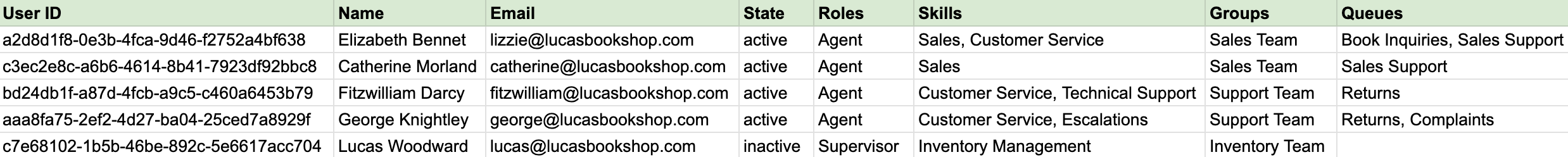 The resulting CSV will contain the User ID, Name, Email, State, Roles, Skills, Groups and Queues of all users.